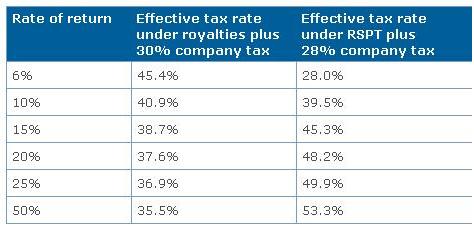 A resource super profits tax is a better way to tax mining companies than royalties however I feel the tax kicks in too early. Take a look at this graph that I pulled from Peter Martin’s blog: http://3.bp.blogspot.com/_KbiBt2BFLiI/S-eST07q8zI/AAAAAAAABJk/MI_JfyC3CbI/s1600/effective+rate1.JPG